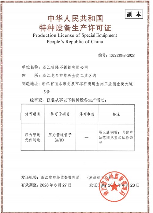 浙江銀隆不銹鋼有限公司創始于2006年,是一家專業生產不銹鋼無縫管的企業。公司位于浙江麗水市,企業注冊總資金貳億壹仟柒佰肆拾玖萬元,擁有4家工廠,占地總面積11萬平方米,職工530人,年產不銹鋼無縫管5萬噸。